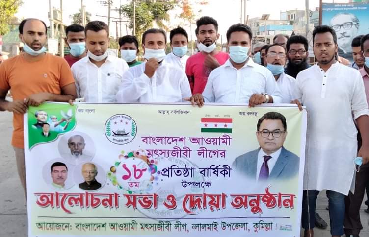 মাছ চাষে গড়বো দেশ, বঙ্গবন্ধুর বাংলাদেশ, মাছ উৎপাদন বৃদ্ধি করি সুখি সমৃদ্ধ দেশ গড়ি’ এই শ্লোগানকে সামনে রেখে বাংলাদেশ আওয়ামী মৎস্যজীবী লীগের ১৮ তম প্রতিষ্ঠা বার্ষিকী উদযাপন উপলক্ষে লালমাই উপজেলা মৎস্যজীবী লীগের আয়োজনে আলোচনা সভা, কেক কাটা ও দোয়া মাহফিলের আয়োজন করা হয়েছে।