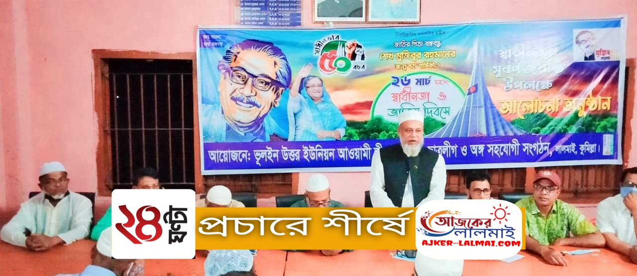 মহান স্বাধীনতা ও জাতীয় দিবস বাংলাদেশের মানুষের জাতীয় জীবনে এক গৌরবোজ্জ্বল দিন। লাখো শহীদের জীবনের বিনিময়ে অর্জিত স্বাধীনতার এ বছর মহান স্বাধীনতার ৫০ বছর পূর্তি তথা সূবর্ণ জয়ন্তী। এ দিনটিকে স্মরণ করে শুক্রবার ২৬ শে মার্চ বিকেল ৩ টায় লালমাই উপজেলার ভূলইন উত্তর ইউনিয়ন পরিষদ মিলনায়তনে আওয়ামীলীগ, যুবলীগ, ছাত্রলীগ ও অঙ্গ সহযোগী সংগঠনের উদ্যোগে স্বাধীনতার সুবর্ণ জয়ন্তী উপলক্ষে আলোচনা সভা অনুষ্ঠিত হয়।