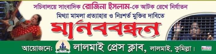 প্রথম আলোর সিনিয়র সাংবাদিক রোজিনা ইসলাম’কে সচিবালয়ে হেনস্তা ও তাঁর বিরুদ্ধে করা মিথ্যা মামলা প্রত্যাহার করে নিঃশর্ত মুক্তির দাবিতে লালমাই প্রেসক্লাব এর আয়োজনে মানববন্ধন কর্মসূচী পালিত হয়েছে।