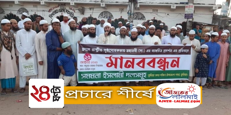 আজকের লালমাই ডেস্কঃ- ফ্রান্সে রাষ্ট্রীয় পৃষ্ঠপোষকতায় মহানবী হযরত মোহাম্মদ (সঃ) এর ব্যাঙ্গচিত্র প্রদর্শন করার প্রতিবাদে রবিবার বাদ আসর কুমিল্লা পদুয়ার বাজার বিশ্বরোড এলাকায় সমমনা ইসলামী দলগুলোর উদ্যোগে মানববন্ধন কর্মসূচি বিস্তারিত....